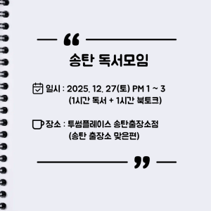 ・1시간 동안 각자 가져온 책을 읽고, 1시간 동안 자유롭게 북 토크 진행(당일 카카오톡 단톡방에 공지 예정)
