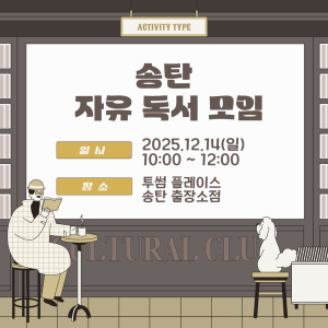 ・1시간 동안 각자 가져온 책을 읽고, 1시간 동안 자유롭게 북 토크 진행(당일 카카오톡 단톡방에 공지 예정)
