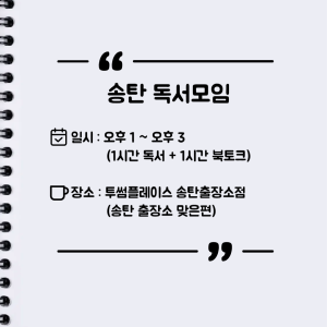・1시간 동안 각자 가져온 책을 읽고, 1시간 동안 자유롭게 북 토크 진행(당일 카카오톡 단톡방에 공지 예정)
